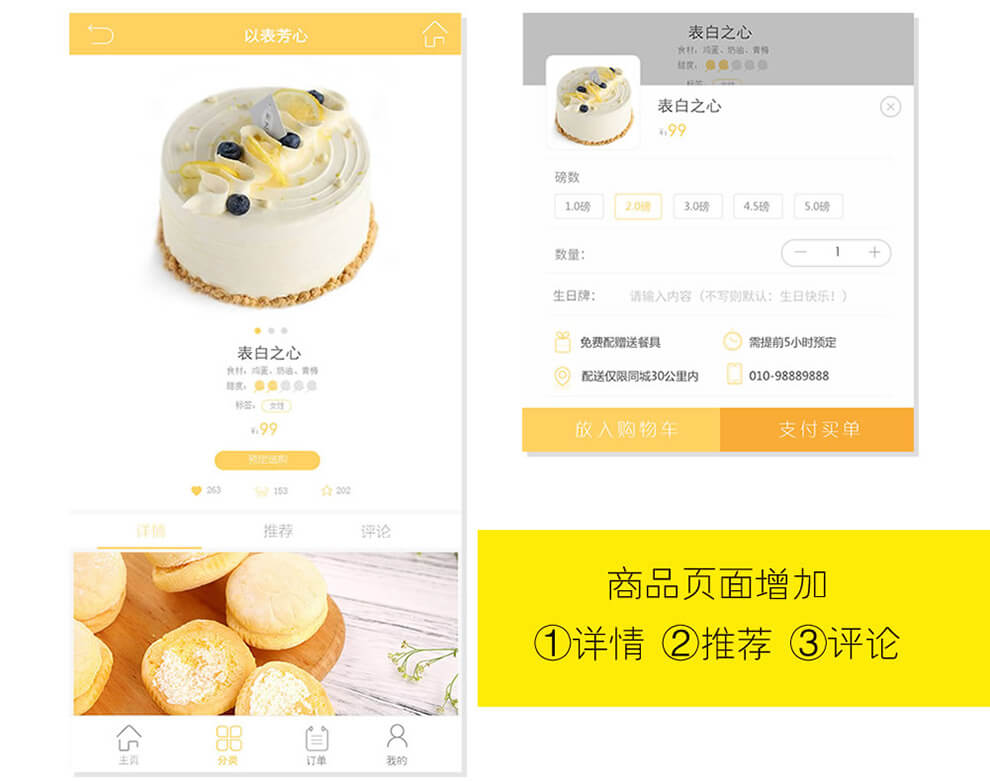 蛋糕订购,购物车,优惠卷,提醒系统,会员中心,商品展示(商品详情,推荐及商品评价),会员卡系统(充值,支付),商家手机处理订单(接单、送货),短信、模版消息,订单动态,订单自动打印,主题切换